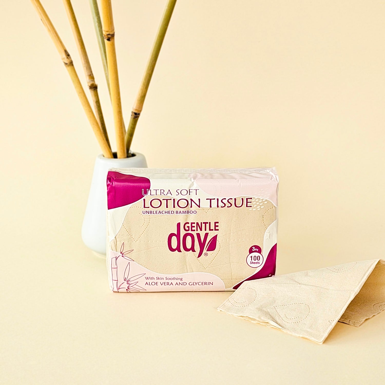 Lotion Tissue made of unbleached bamboo cellulose. Super soft and gentle, enriched with glycerin and aloe vera lotion, perfect for sensitive skin.